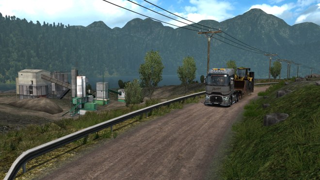 I switch trucks quite frequently. Here’s one of my Renault T’s finished in a special Berliet livery, helping to complete the Miner achievement by delivering to a quarry in Stavanger…