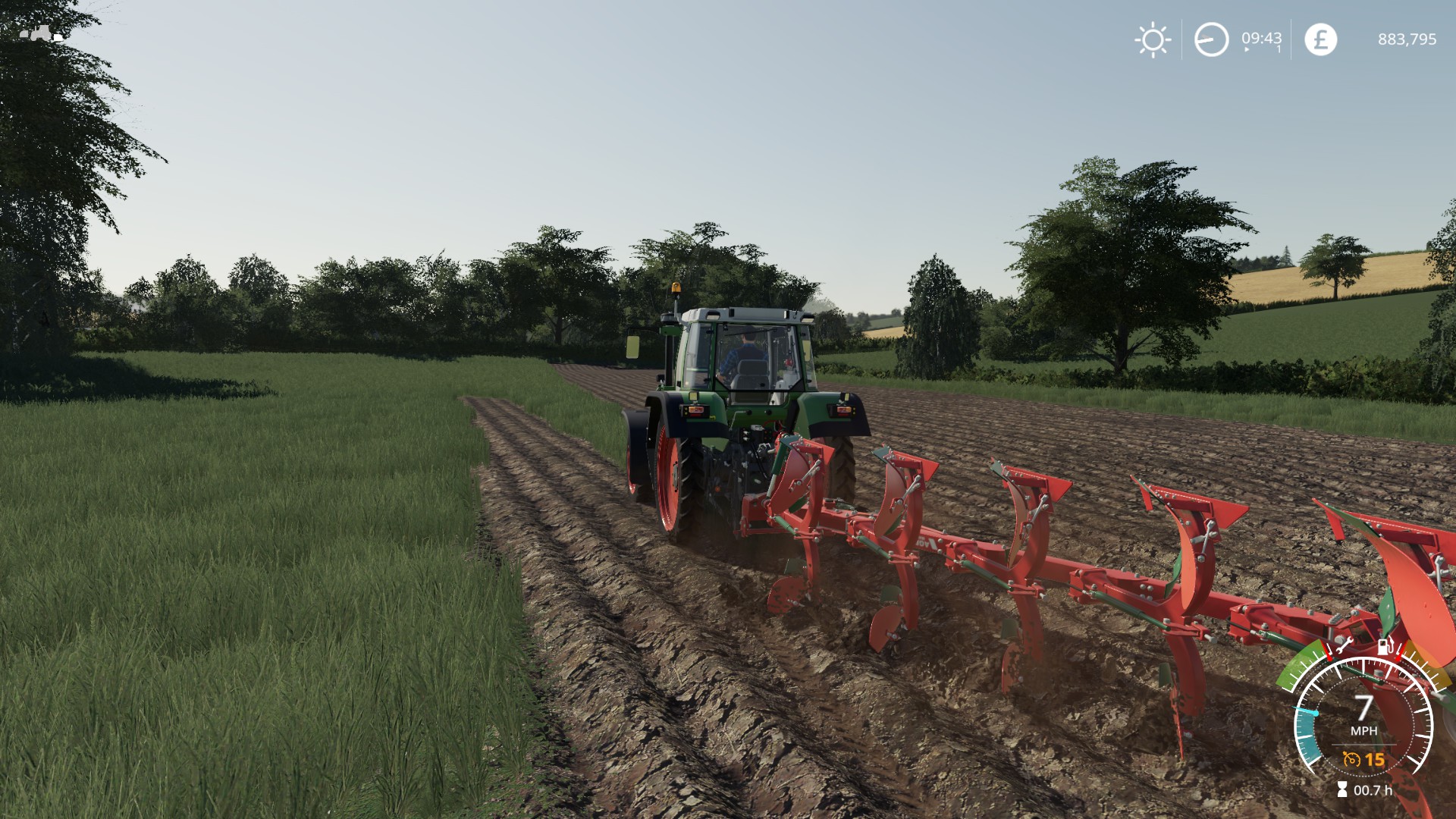 …It’s very important to watch the Horsepower rating of the tools you buy to make sure that you don’t buy something your tractor can’t pull! As an aside I did notice that, back in 2018 when this version of Farming Simulator released, the plough I’ve bought was rated as needing 180HP so I guess initial gameplay identified that as an issue and resulted in a lowering (nerfing?) of the required HP to make the plough more suited to smaller tractors.