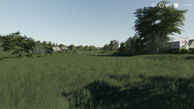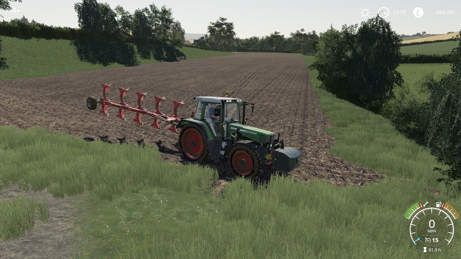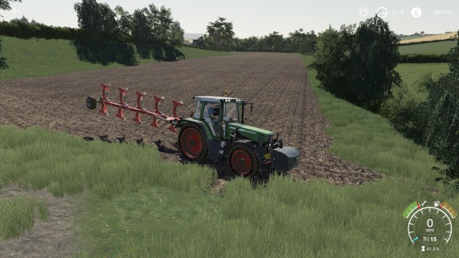 …You’ll notice an odd diagonal cut in the image above. To create a new workable field I had to turn on ‘allow field creation’ in the game and that was an initial test cut before getting down to ploughing proper. Normally ‘allow field creation’ is kept off so that you don’t plough away field boudaries, etc. Here’s our finished new field – not going to win a ploughing contest, but it’s neat enough for our purposes…