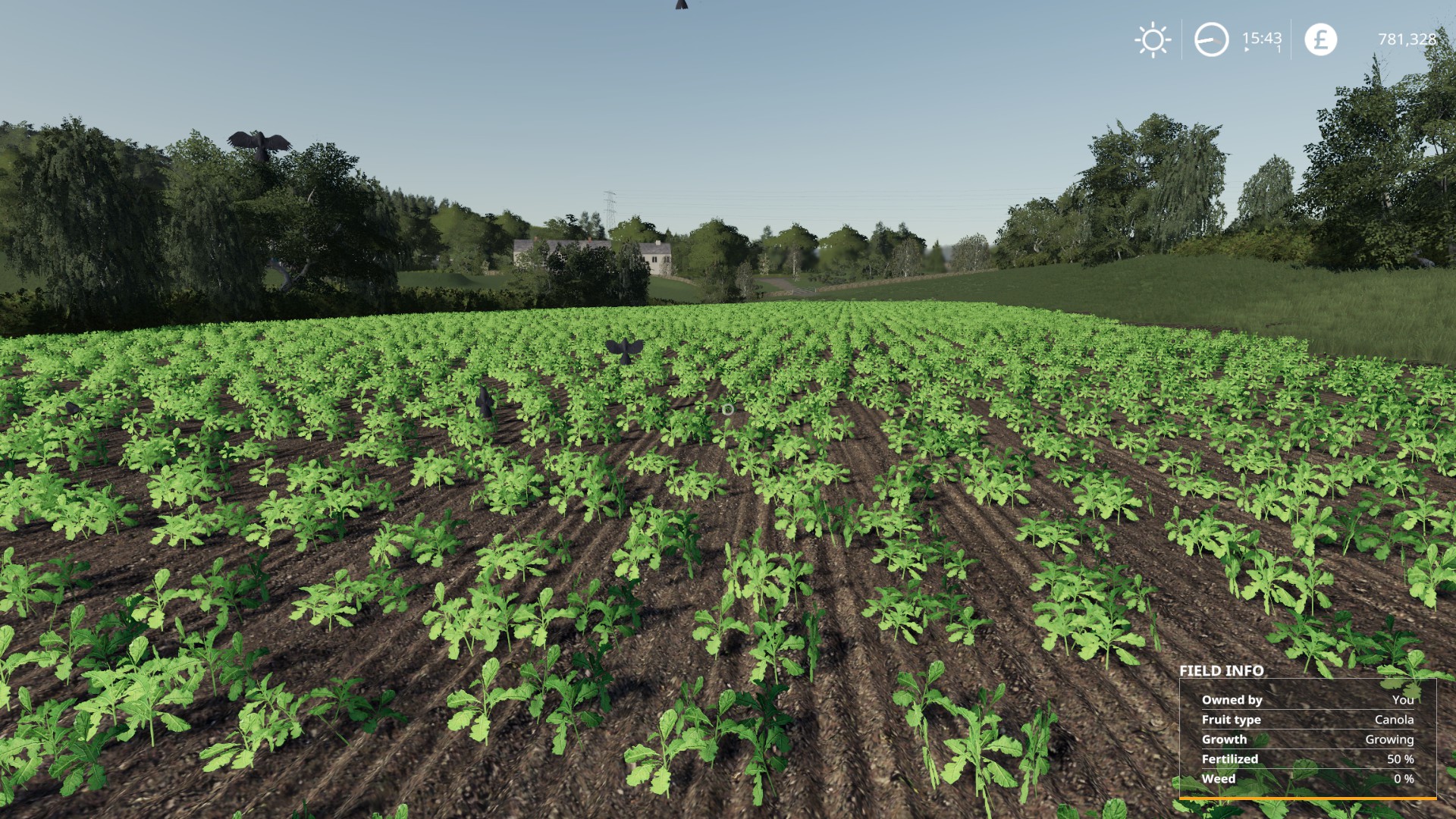 …And some crows being shooed away 😉 As before, I did fertilize Mason’s field for nearly 10K while waiting for my crop to show through. Now they’re above ground, I have to fertilize my field once more to get the best yield. I won’t bore you with pictures of that action nor with two other fertilizing jobs for Mason in field 36 which between them earned me over 26k – the three jobs I’ve done for my fellow farmer have paid the cost of buying the spreader now! This ‘softly, softly’ approach, starting with small machines, a single unprepared field and only buying what I need, when I need, is working out well. I can’t remember when I’ve ever had so much money still in the bank at this stage and in terms of game time, we still have several hours of the first day left to work.