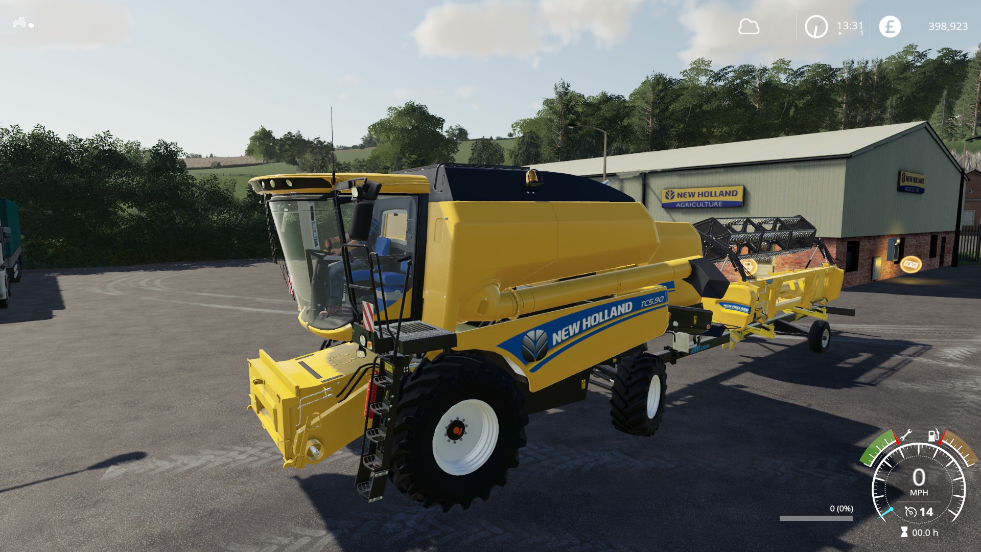 The New Holland TC5.90 which has a 5.5m header and a 258HP engine. This was the most expensive at £185k for Harvester and Head. When I factored in the higher horse power which was desirable for working some of the fields in the valley, I felt that the TC5.90 was worth the slightly higher price over the other harvesters. Here it is parked outside the dealer…