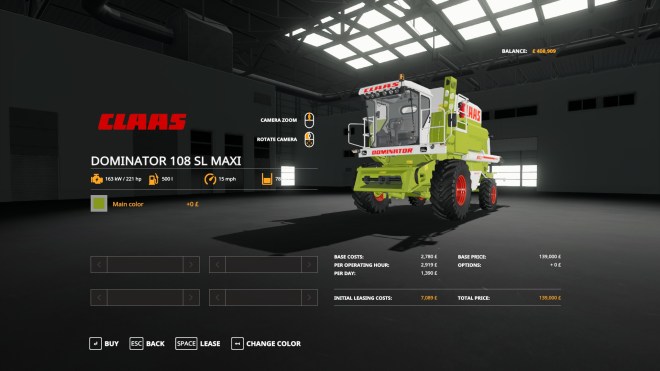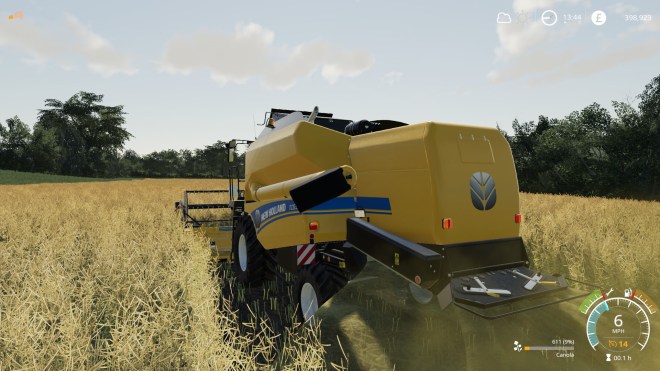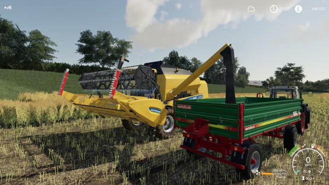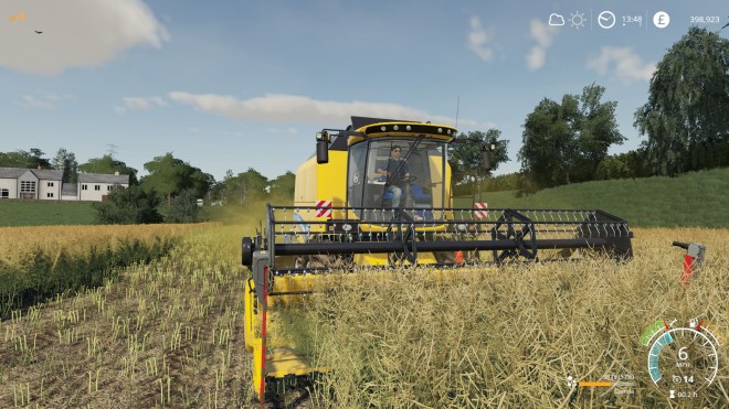 While I’ve been working the crop has been through its flowering cycle and has set seed. By midday it is ready to harvest! The speed that crops grow and ripen in Farming Sim requires the player to suspend belief but if they reached ready to harvest state in normal time it would be a pretty boring game. Frankly, the game is mainly about playing with farm equipment and the plants and animals are really only there to provide a reason to do so 😉 And, the crop being ready to harvest means it’s time to buy myself a Harvester. The vehicle will again be small and I’m keeping a tight grip on the budget. Much as I would like to buy the Claas Tucano again (see the first post in the original series) I can’t justify the cost. John Deere were also over the budget I was prepared to pay. I narrowed it down to three possibilities – two are vehicles from the modhub and one was a bonus addition to the game with the Claas Platinum Pack.