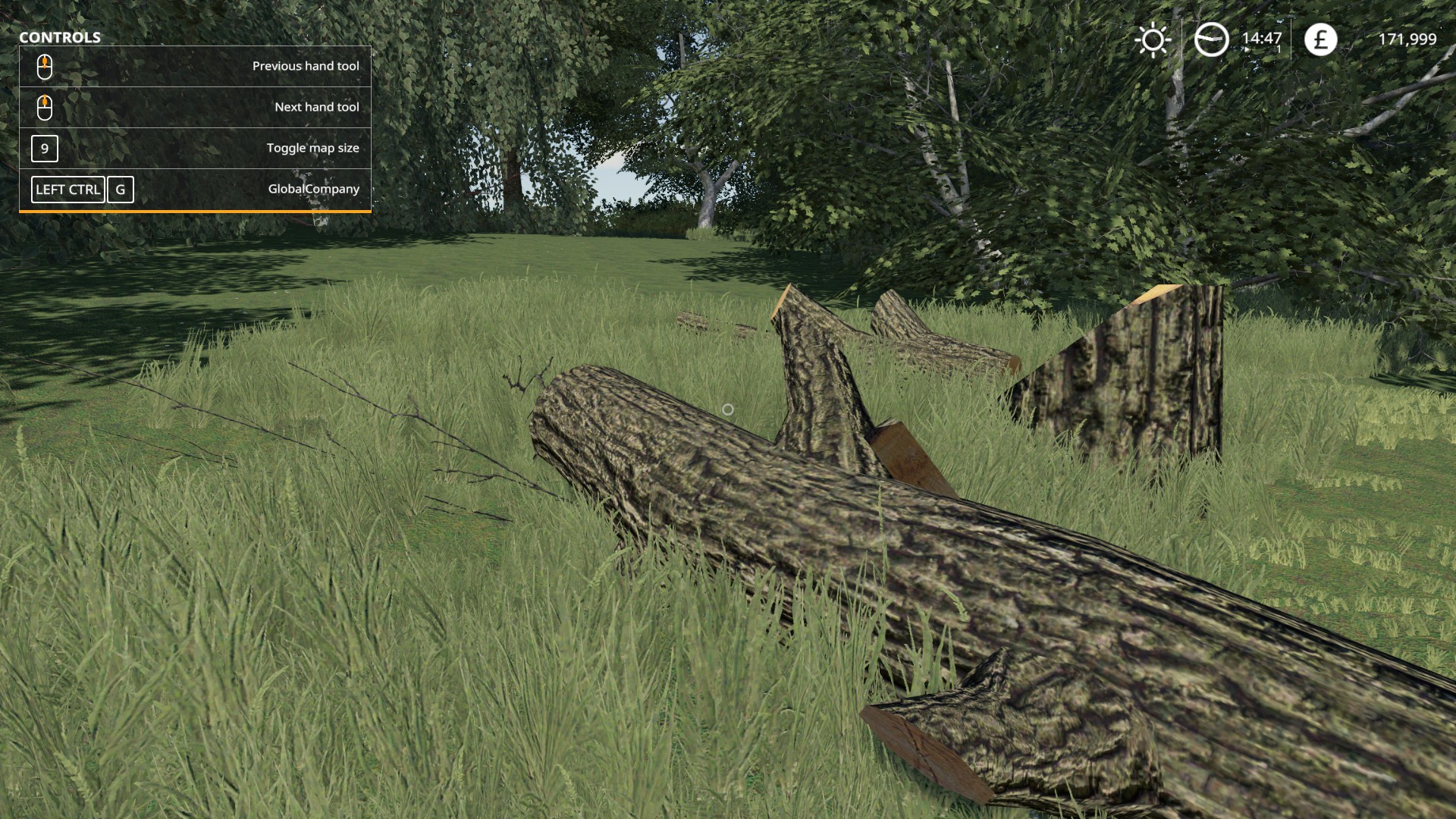 Removing trees in a proper forestry setting is something that you can get specialist machinery for and if I was farming on a Scandinavian map, for example, one aspect of my farming might include using such machines. But Gloucestershire is very much arable farming country so I’m using a chainsaw to chop down the trees and cut them into transportable pieces of timber. The Massey 3090 is hauling the wood away in the Metaltech trailer…