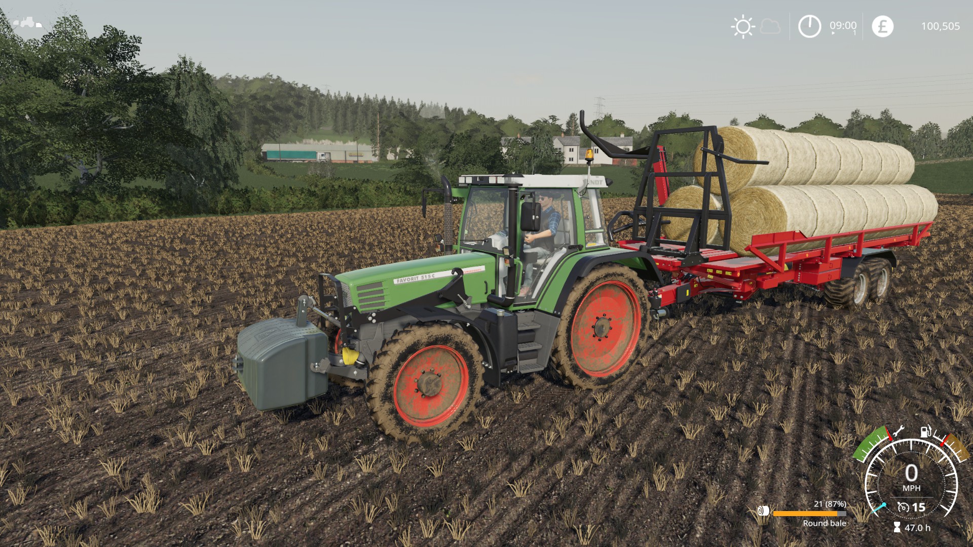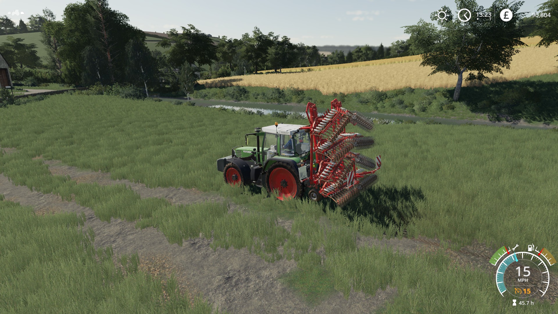 Lots of work being done on the farm and a couple of unintended purchases see my working balance stable at around £110k. The first of these purchases was a weeder – the Einbock Aerostar-Rotation 1200, which as you might guess clears a 12m swathe of weeds at a time. Early in game I chose to do my weed removal using the Hardi sprayer that I have shared images of in action. The reason for choosing to buy that first was the nature of weeds – the pesky varmints can show up on your fields at any stage of crop growth and herbicide can be used to remove them at any time. A Weeder however can only be used before the crops get to their second growth stage so if you can only afford one means of dealing with weeds, herbicide is the way to go. With stable income now assured on my farm, I can afford to add a weeder and that in turn means I can take jobs from other farmers that specify using a weeder. Here it is unfolding for just such a job for Mason in field 36…