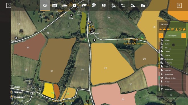 …With the exception of Triangle Field up by the stables, my fields are to the west of the north-south road. Field 14, now known as Coberley Field and Field 13 – Manor Field, form a southern end to my territory whilst Ale House Field sits opposite my farm buildings with Spinney Field to the south. The glaring gap in my field ownership is 36, currently owned by Mason. I think that field defines my initial goal and my stretch target would be owning field 34 to the west of my farm buildings, also one of Mason’s although he never seems to have a crop in it! If I reach my target then current experience tells me that I will be too busy managing the fields that I own to expand the farm further. That, then is my end game for this map.