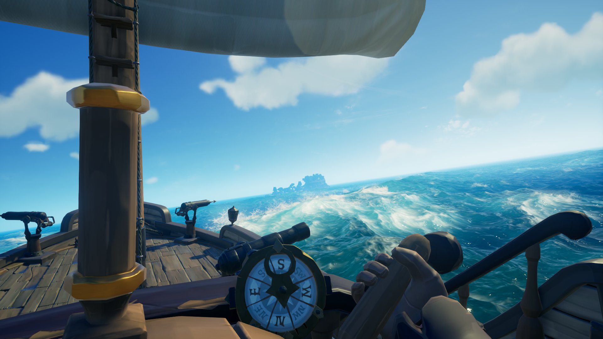 One final experience I had today was a real challenge. After digging up a treasure chest on one island as part of a mission, I was working out where I needed to go to next when the sky grew dark and the rain started falling. I quickly realised that my sloop was taking on water, so I started bailing. However, I could hear the ship’s bell ringing intermittently too. Moving up to the top deck I found we were swing around helplessly as the wheel moved of its own accord. I realised I was going to have to get the ship under way to get some measure of control so I raised the anchor and unfurled the sail. With the compass spinning uncontrollably, I spent the next 15 minutes trying to hold a course out of the storm whilst avoiding rocks and taking short spells at bailing out the ever incoming water. Finally I got clear and the feeling of elation at having survived the storm was palpable. There is definitely much more to this game than a PvP sandbox 🙂