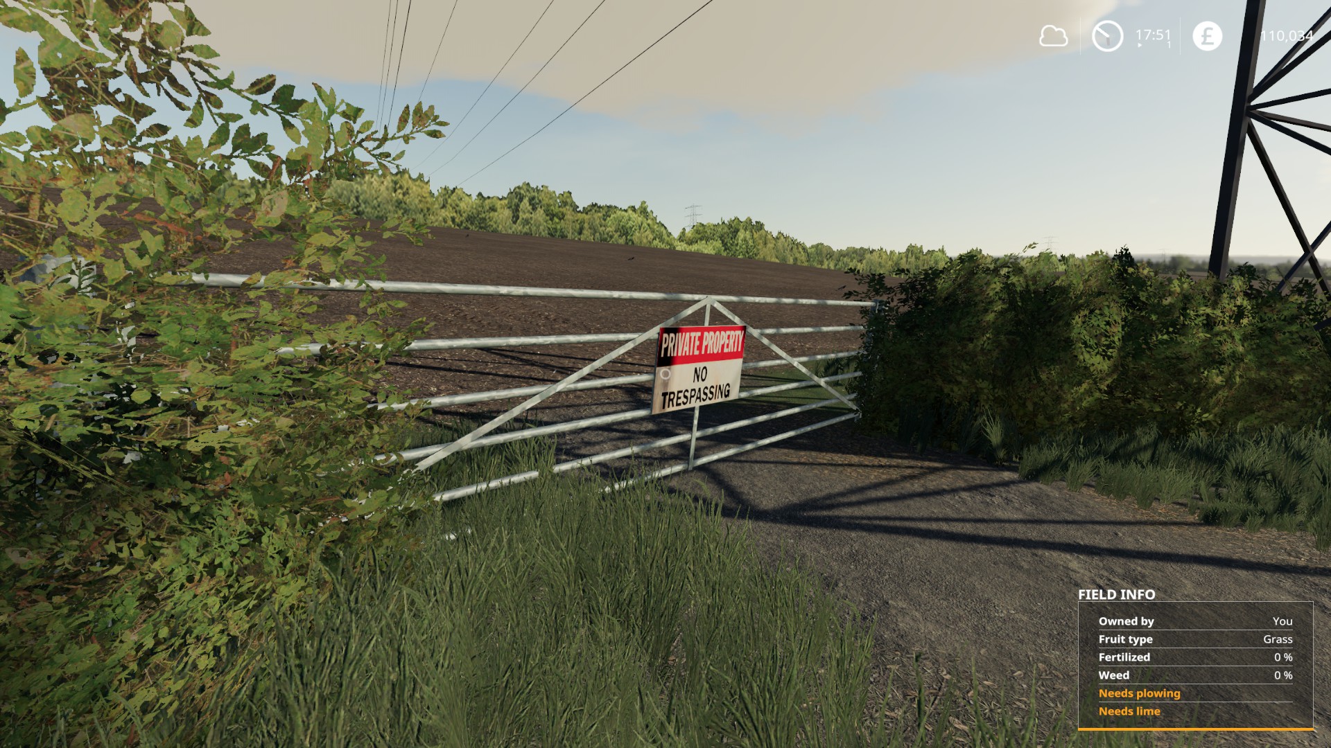 Those who looked closely at the green areas of the map will have noted that I appear to own the large field to the north of Field 47 – it was part of the ‘spare’ land that you can buy for £0 and which I bought to allow me to expand Field 4 into what I now call Spinney Field. Why don’t I use that? Firstly, there’s no direct access without driving across other fields. There is a hedge all around the field with the exception of a gate at the boundary with Field 31…