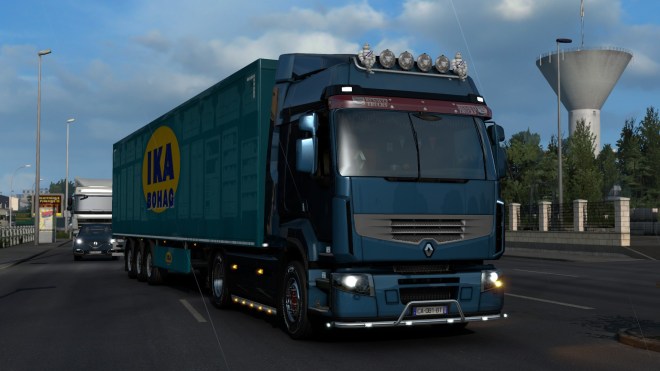 Another trip out in SCS Software’s Euro Truck Simulator 2. On this run I’m driving my Renault Premium named ‘Isobella’ – she has a 430HP engine and a 12sp automatic gearbox – and I have an 18t load of film rolls bound for Rennes. Here is a screenshot of Isobella in action on a different run so you can see what she looks like on the outside…