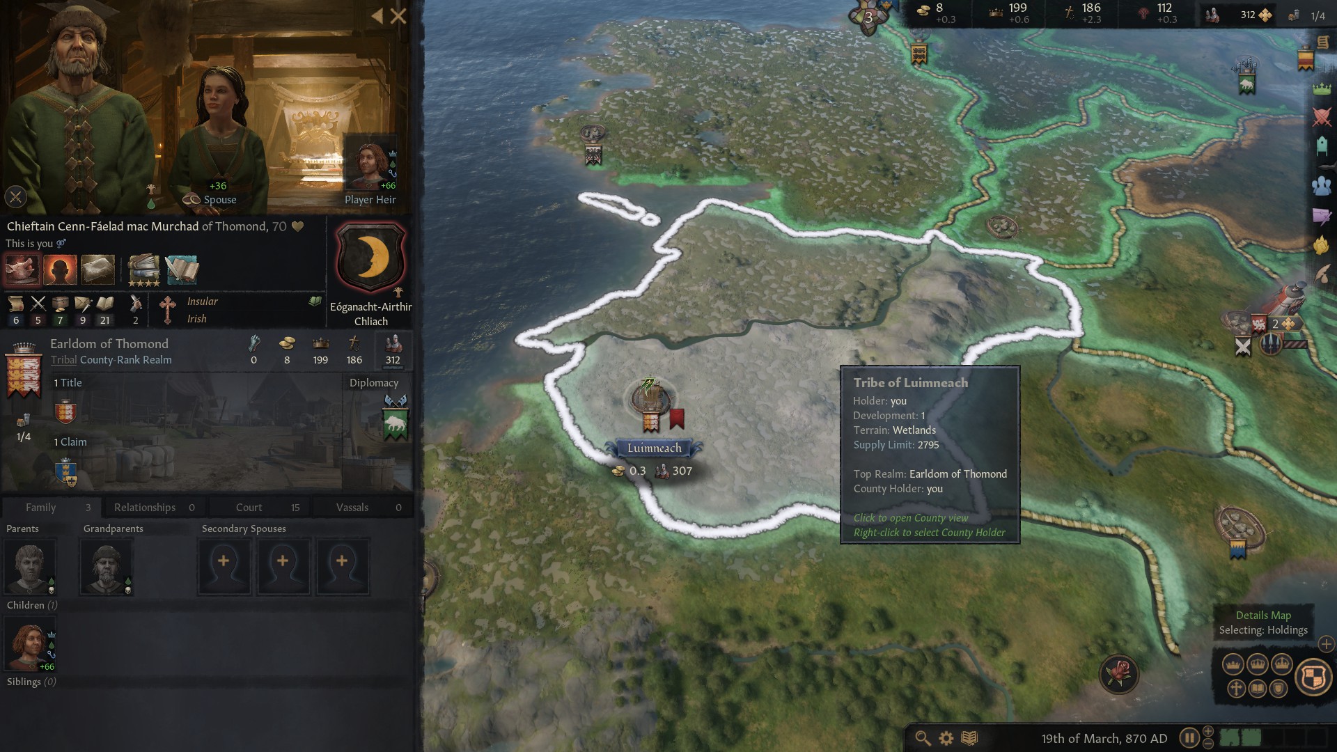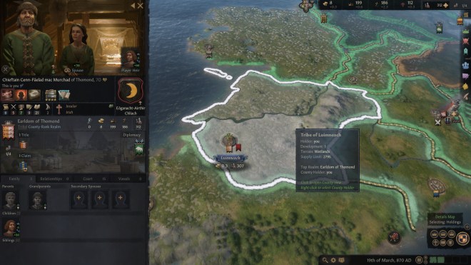 When you first start a new game you are presented with the option to choose from a selection of ‘interesting’ rulers from two different dates, 1066 and 867. Each of the suggested rulers has a rating, Easy to Hard. For my initial post I opted to play Petty King Murchad in 1066 – the game version of the tutorial. There is one final option when selecting who to play as – you can click on a button in the bottom left of the screen to play as any ruler. That’s what I am currently trying out. I chose the year 867 and then selected the Earldom of Thomond – effectively the ancestor of Petty King Murchad π The game then proceeds until either the last member of your dynasty dies or you reach the year 1453 (that can be changed in the background mechanics).