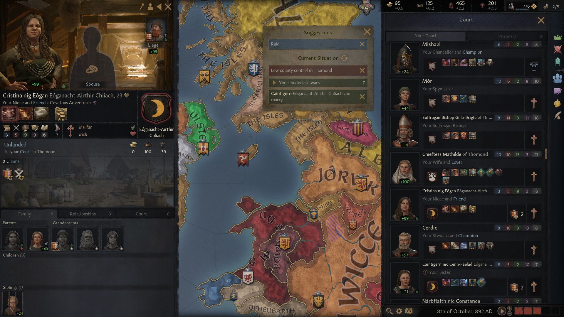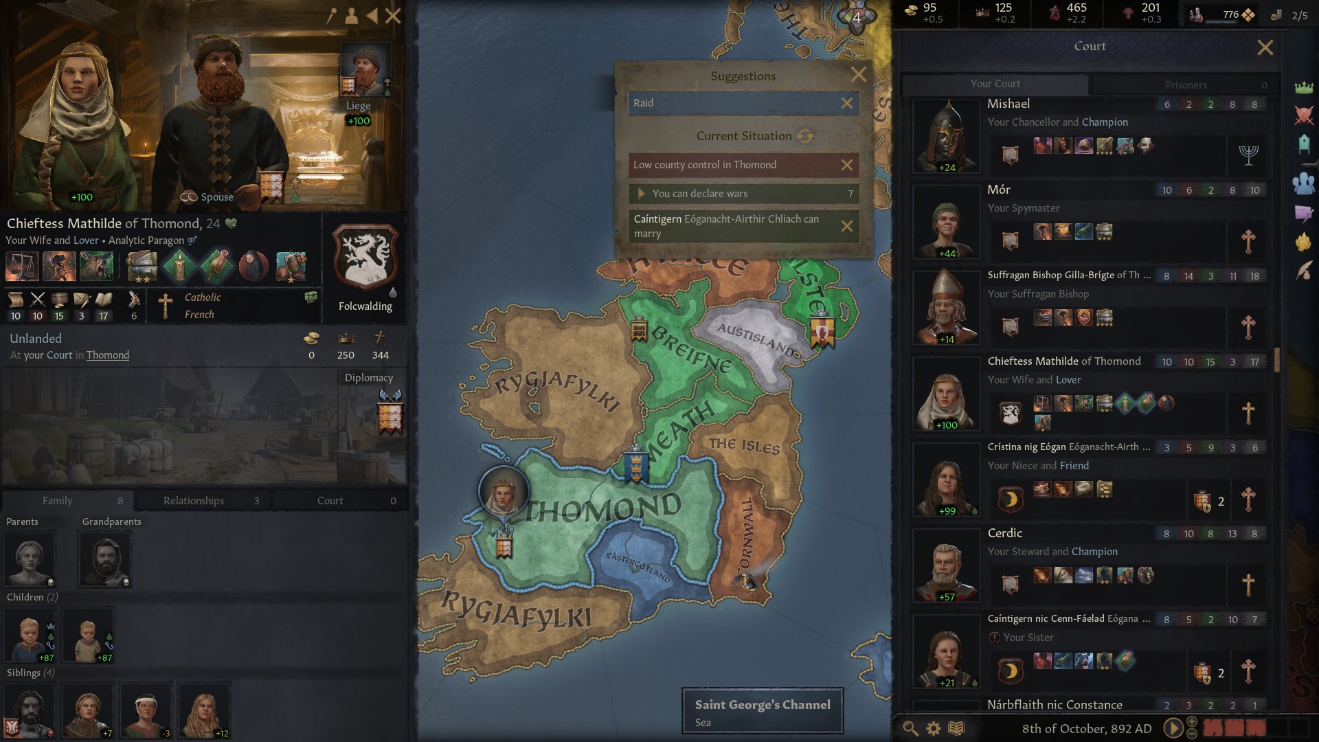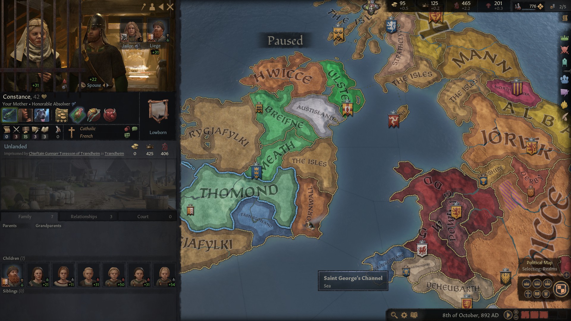 Which brings us to a sad tale. When my Father died, my Mother was still a young woman and very attractive. I guess it was only natural that she would have an affair with someone and she chose one of my knights who was also my Chancellor. That’s fine as long as it stays secret. Unfortunately, it became public knowledge. I pondered what to do? π¦ With the Bishop frowning at this sin and the loss of his endorsement looming, I decided that if they wanted to fornicate then they should perhaps be doing it within wedlock so I arranged for them to get married. Their opinion of me went up, the bishop stopped frowning and his approval also rose. Great result all round, or so I thought. Just a couple of years later and my Mother is having an affair outside of her marriage with another of my knights! She’s now a Fornicator and an Adulterer. That was a step too far, I had to put her in gaol. In a world where the endorsement of the church holds significant importance – they won’t pay taxes or supply levies if my bishop doesn’t endorse me – I have to protect my standing as a pious ruler (even if I do sometimes think about an extra-marital affair with Cristina!). My mother’s actions are actually serious crimes in medieval terms and in 890 I took the difficult decision to release her and banish her from the realm. Banishment was an extreme punishment at the time and could result in the ruler being considered a tyrant. But, because of the seriousness of my mother’s repeat indiscretions, I have not been labelled as such and my mother accepted my decision without lowering her opinion of me. In 892 here she is…