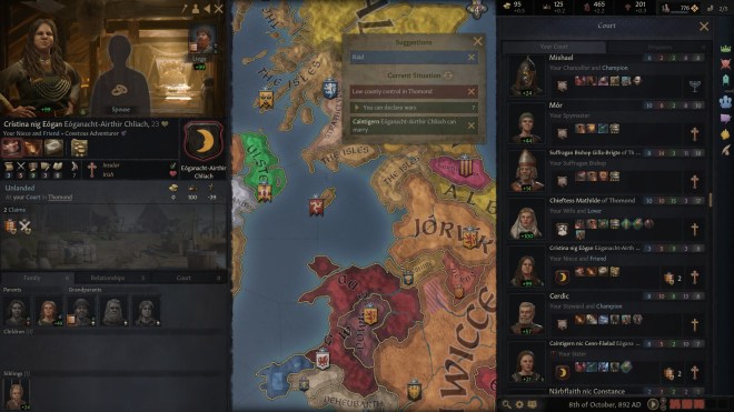 …I don’t know how far into this game-save I will go before starting a new one. I’m still getting an understanding of the game mechanics and what matters to be a successful ruler and expand my realm. As illustrated above, there are lots of things that happen within the court that provide distraction from the bigger picture although, how you deal with them can affect your standing with the other game characters in a positive or negative way. One thing to be aware of – the developers tell us that every character in game has an opinion of every other character so it’s important to keep your friends on-side and, if possible, your enemies too! π