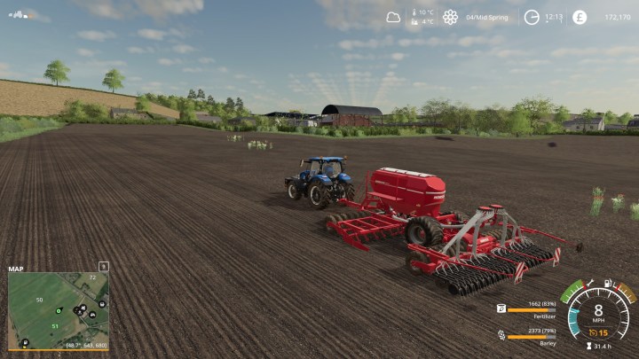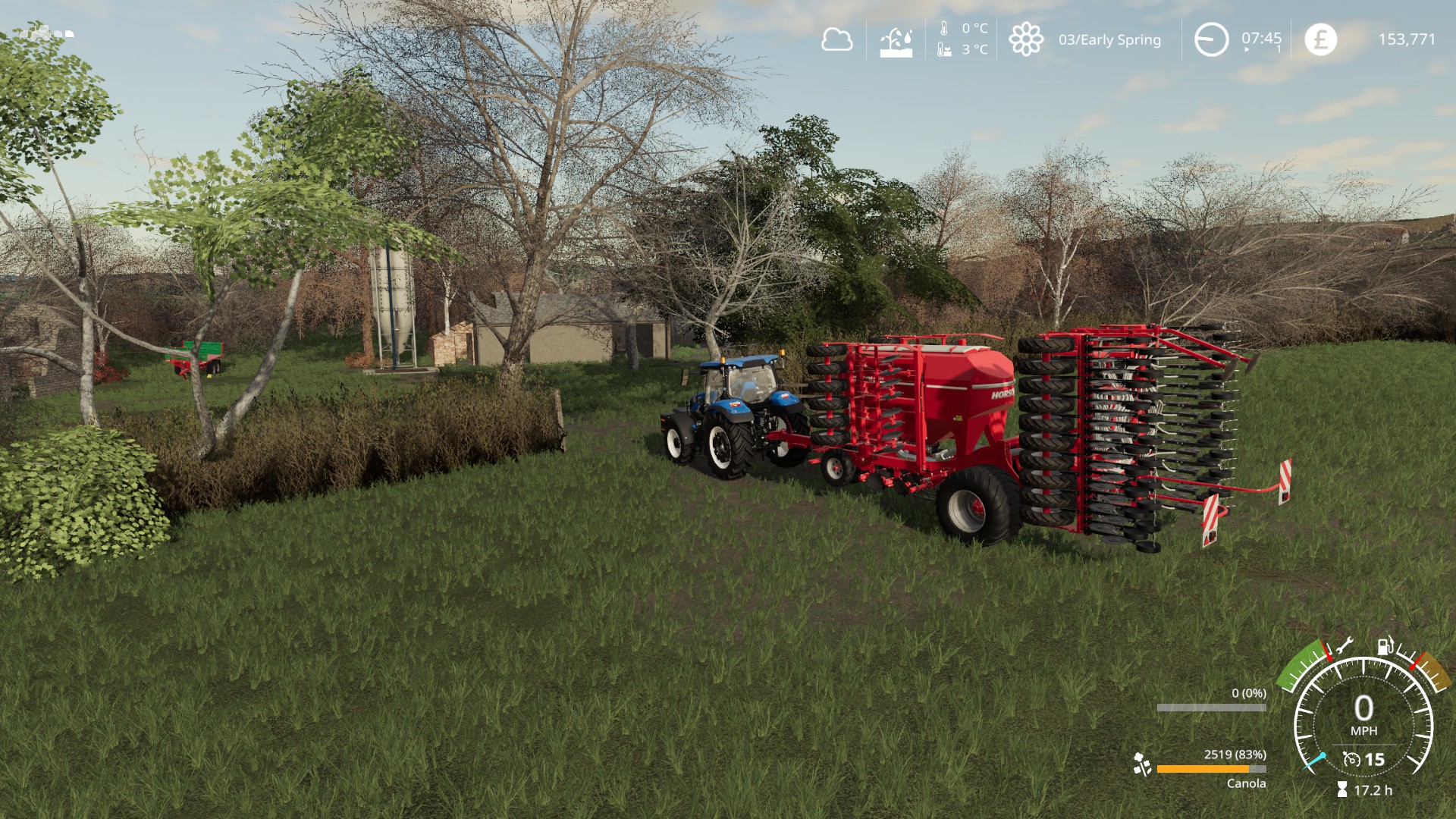 I’ve been working hard on other farms to make money and finance the cost of the equipment I will need on my own farm going forwards. In late March, the first sowing jobs appeared despite the soil temperature remaining lower than ideal. Initially there were potato’s to sow. Despite the huge payouts for doing them, I left those jobs alone as they will take a lot of time to complete. Then the first Wheat sowing job appeared along with one for Oats. To take these jobs I bought a seeder – I’m going to need one myself soon so it seemed an opportune time. I went with the Horsch Pronto 6AS again as it served me well on Oak Glen Farm but this time I’ve bought the associated SW3500 tank to go with it as the size of most of the fields around justify the much larger capacity…