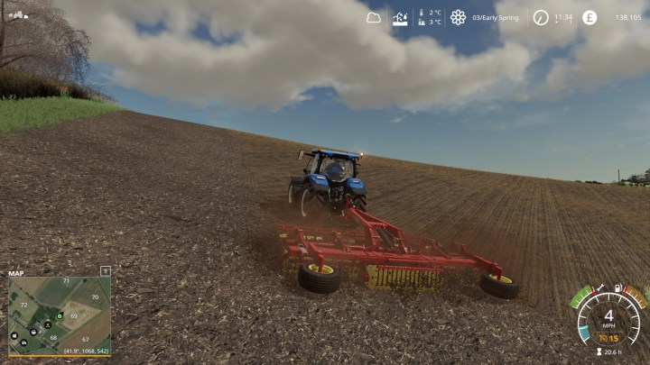 I had been doing a lot of cultivating using the Kuhn subsoiler but its fixed 4m width was making any trip along Duken Lane past the pub very difficult as the road is only barely wider than 4m there. It was also a liability when running on the main road – always having to weave around lamp posts when there was a gap in the oncoming traffic so as to avoid a collision. I’m not going to sell the Subsoiler – it has its place on my farm – but I needed a more transport-friendly piece of equipment for cultivating jobs. Although I went for the Horsch seeder that I know, one thing I’m trying to do on this farm is use different equipment, so I looked at the various cultivators in-game and on the mod-hub. I chose the Vaderstad Carrier 500 Disc Harrow. It folds up nicely for transport between fields and has a working width of 5m. It is also within the power of my current tractor which comes in handy when some of the local fields resemble a ski-jump…