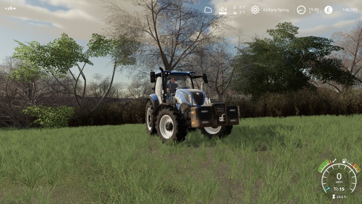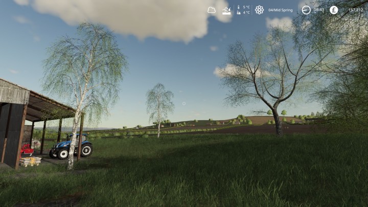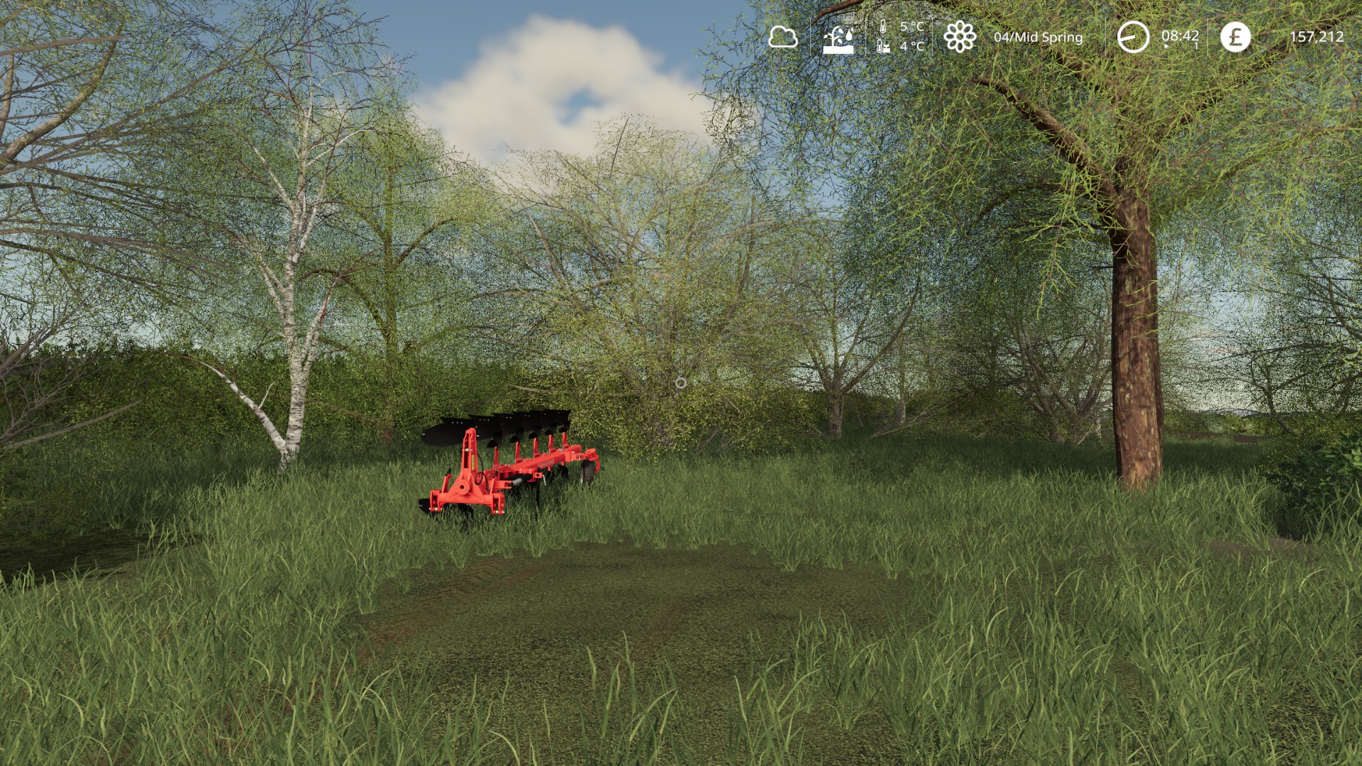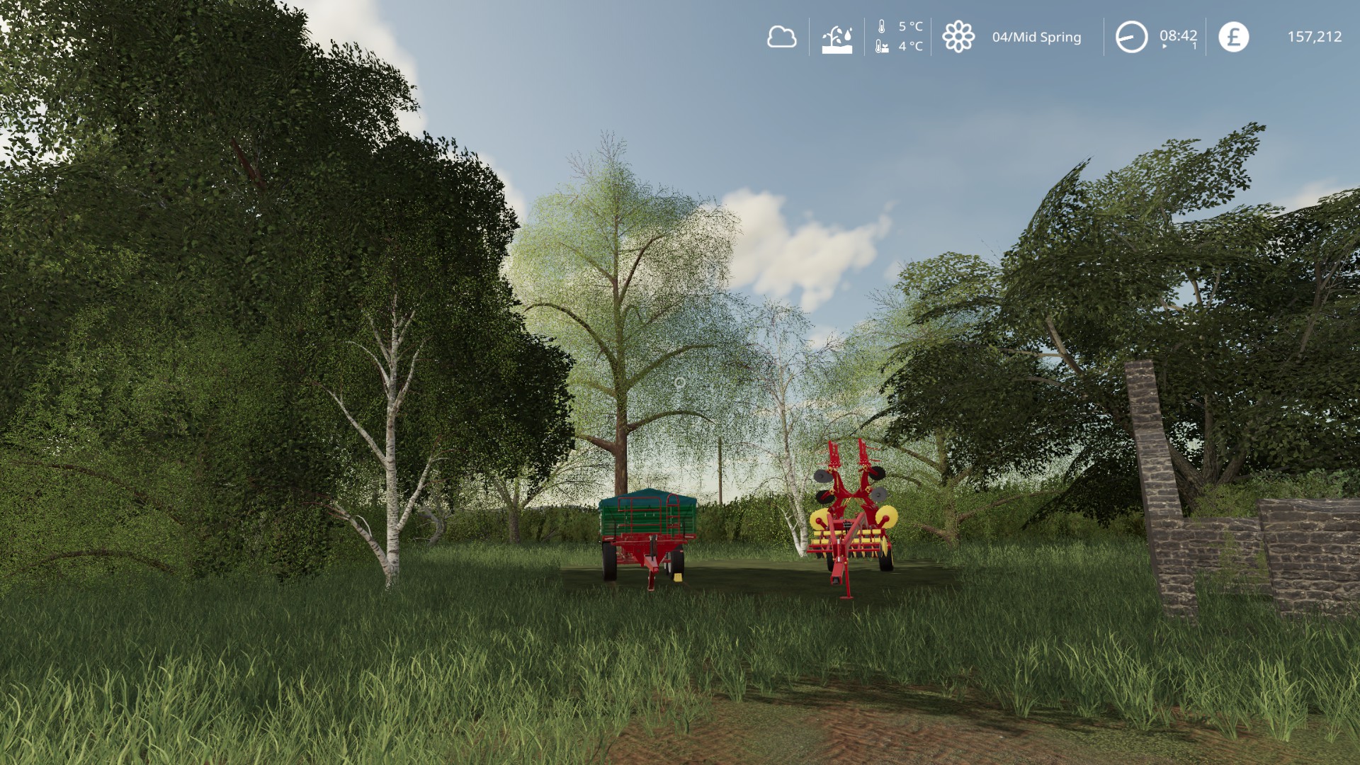 I’ve done more ploughing jobs and some transporting – there’s definitely plenty of variety in the jobs. I often pick a job, hitch up the required equipment and then wind up doing another job requiring the same equipment after the first is completed! And I’m still finding new areas of the map to visit! Back on my own farm in early April, I completed the tidy up by removing some more low growing shrubs and trees to create a bit of open parking space for the equipment. I promised that this time I wouldn’t be doing any wholesale tree clearance and I’ve stuck to that – well almost. While using the Biobeltz stump grinder to remove one set of saplings, a full sized tree just upped and disappeared on me! Not my fault – that’s a map/game issue! Anyway, the good news is that, unlike the real world, you can just stick in a replacement tree – I used one of AlienJim’s season’s ready placeable trees. Here’s the cleared area with the Vaderstad and the MetalTech trailer parked up…