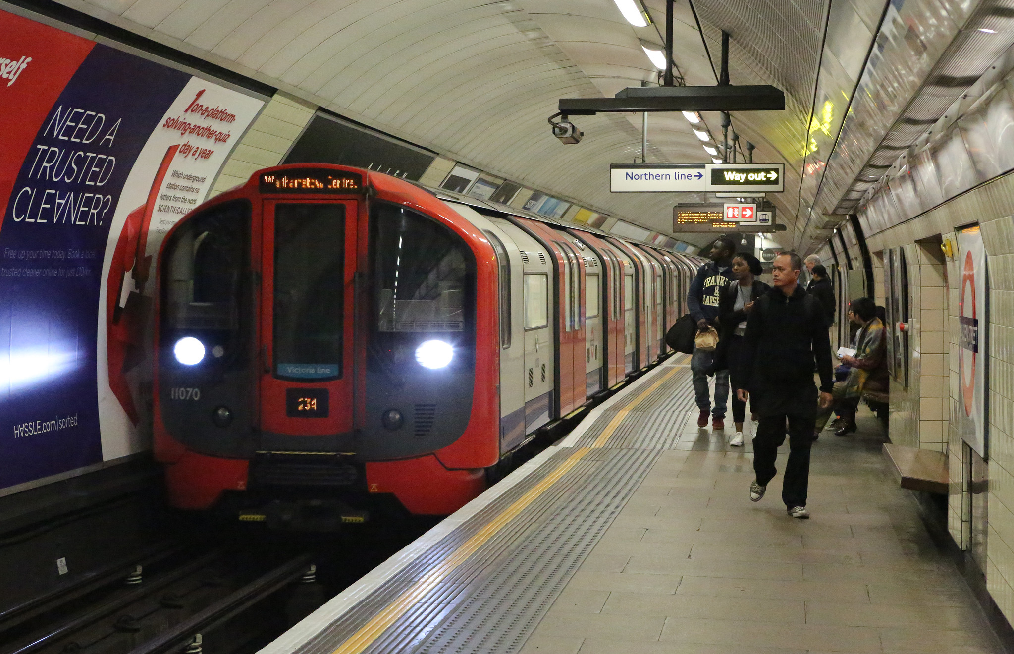 The Underground is also referred to as The Tube because its deep level lines travel in tubular Tunnels under central London – Victoria Line train at Warren Street…