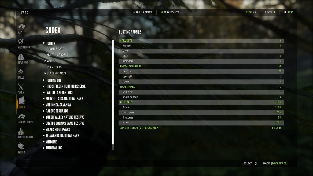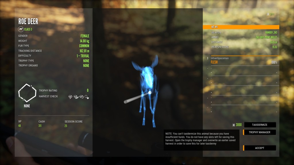 …Low powered soft point amunition doesn’t have the ability to penetrate muscle. You can see that the shot was on target to probably hit the animal’s heart and one of the lungs but the bullet just can’t get through the muscle at the front of the chest. The result is the deer runs off for a moderate distance before succumbing to blood loss and I loose some XP and cash. So, the first advice for any beginner is try to shoot all your early animals from close range and the side until you unlock access to Polymer Tipped amunition. Even then, side-on shots are generally a safer option as you have a larger target to hit with less muscle and bone in the way!