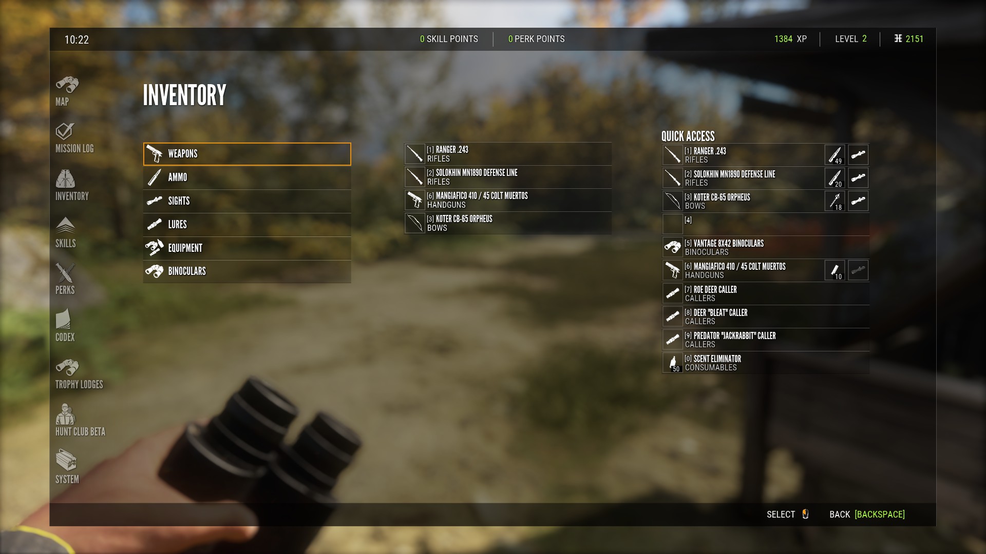 In my closeout post for last year I suggested that I would be resetting my The Hunter – Call of the Wild profile and starting out again. I have now done that and set out on the trail anew with a couple of ideas of how I want to progress. I have decided that I will be using mainly the weapons that are free to me courtesy of the DLC’s I have bought plus those guns that are given free to everyone. The exceptions will be those that I need to purchase for certain tasks, ie the Coachmate 45-70 which I will need to complete one of Doc’s challenges in Layton Lakes. Another exception will be the Docent .223 which I will need for Fox and Coyote while reducing the weight I need to carry.