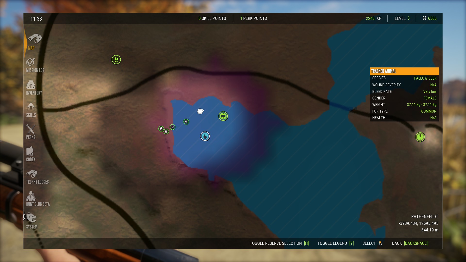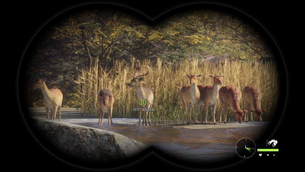 I usually start in Hirschfelden. In each of the original reserves, the first mission is designed to give you your first kill with a small deer that is just standing around waiting for you to shoot it. You’re given some basic weapons – The .243 rifle, a 12 gauge shotgun and the .357 handgun. Also in your pack are three lures – Roe Deer, Bleat and JackRabbit callers (the latter being designed to call Fox and Coyote). You also get basic binoculars. My usual plan of action when starting (I’ve done it a few times for a variety of reasons) is to use a caller to bring the deer to me and then shoot it side on at close range with the shotgun. This will normally result in a quick kill.