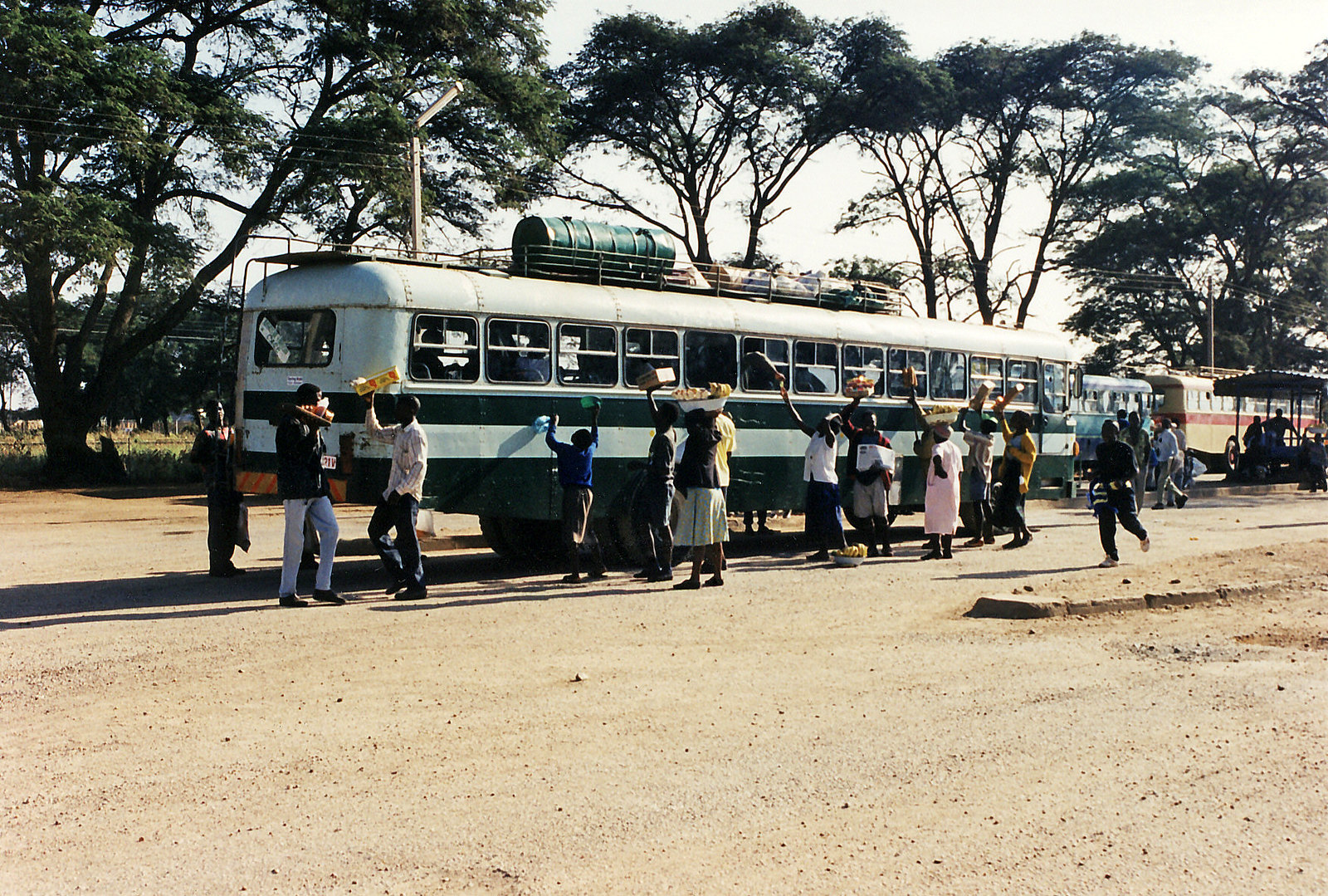 When I married Epi, it was only natural that we should visit her homeland and stay on my Mother-in-Law’s farm. We’ve been there twice – subsequent intended visits were sadly curtailed by her tragic death in a road accident. Zimbabwe has some magnificent scenery and wonderful people – I have always felt welcomed by both my extended family and often by other members of the Shona people as well. While care is always advised in any country you visit, I found myself quickly recognised as the visiting Mukwasha (Son-in-Law) in the local area as my Amai was well known as a local farmer. This meant that, apart from some good-humoured banter when I was guarding the pick-up outside one of the stores, I could behave very much as I would in London. I often drove the pick-up as part of my work during our visits – it took some of the burden of Amai’s shoulders and did useful work for the farm that the labourers couldn’t do. On the occasion when I took this photo, Amai was sourcing medicines for the workers on her farm and I had the opportunity to visit Chegutu bus station opposite the pharmacy. Many long distance buses called here on their way to Harare and local people gathered around each arrival to offer bananas, mangoes and water for sale to the passengers who still had a long trip ahead of them…