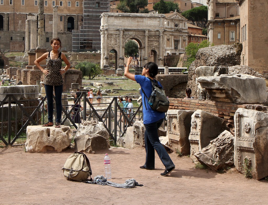 …In many ways they were bringing life to an otherwise dead world. I wonder if they knew they were posing in the Temple of Vesta and the conotations of being a Vestal Virgin? But then I wonder if they were students putting together a portfolio of images for their course. Tourists, like locals, can be fascinating subjects 🙂