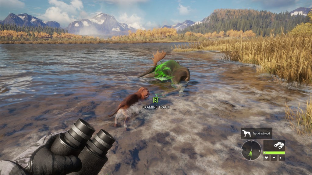 …Not the best looking dog and I’d rather have a Border Collie but Expansive Worlds have only given us Bloodhounds. The advantage of that is the tracking ability when you’ve wounded an animal. After initially struggling a little, Mack is now picking up the scent of blood from a good distance which comes in handy when you shoot a Moose – even mortally wounded, they can run over a kilometre and often choose some good hiding places to finally keel over! This one chose open water having dived through some big reeds that would probably have had me scratching my head even with the tracking aids that we have…