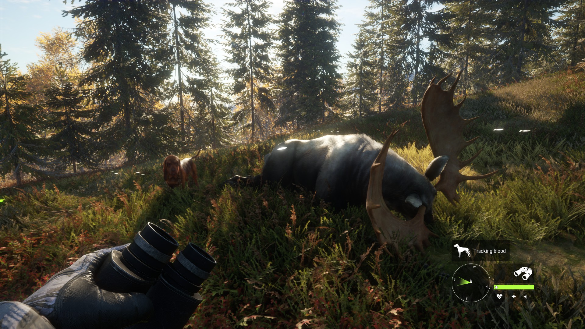 …Not the best looking dog and I’d rather have a Border Collie but Expansive Worlds have only given us Bloodhounds. The advantage of that is the tracking ability when you’ve wounded an animal. After initially struggling a little, Mack is now picking up the scent of blood from a good distance which comes in handy when you shoot a Moose – even mortally wounded, they can run over a kilometre and often choose some good hiding places to finally keel over! This one chose open water having dived through some big reeds that would probably have had me scratching my head even with the tracking aids that we have…