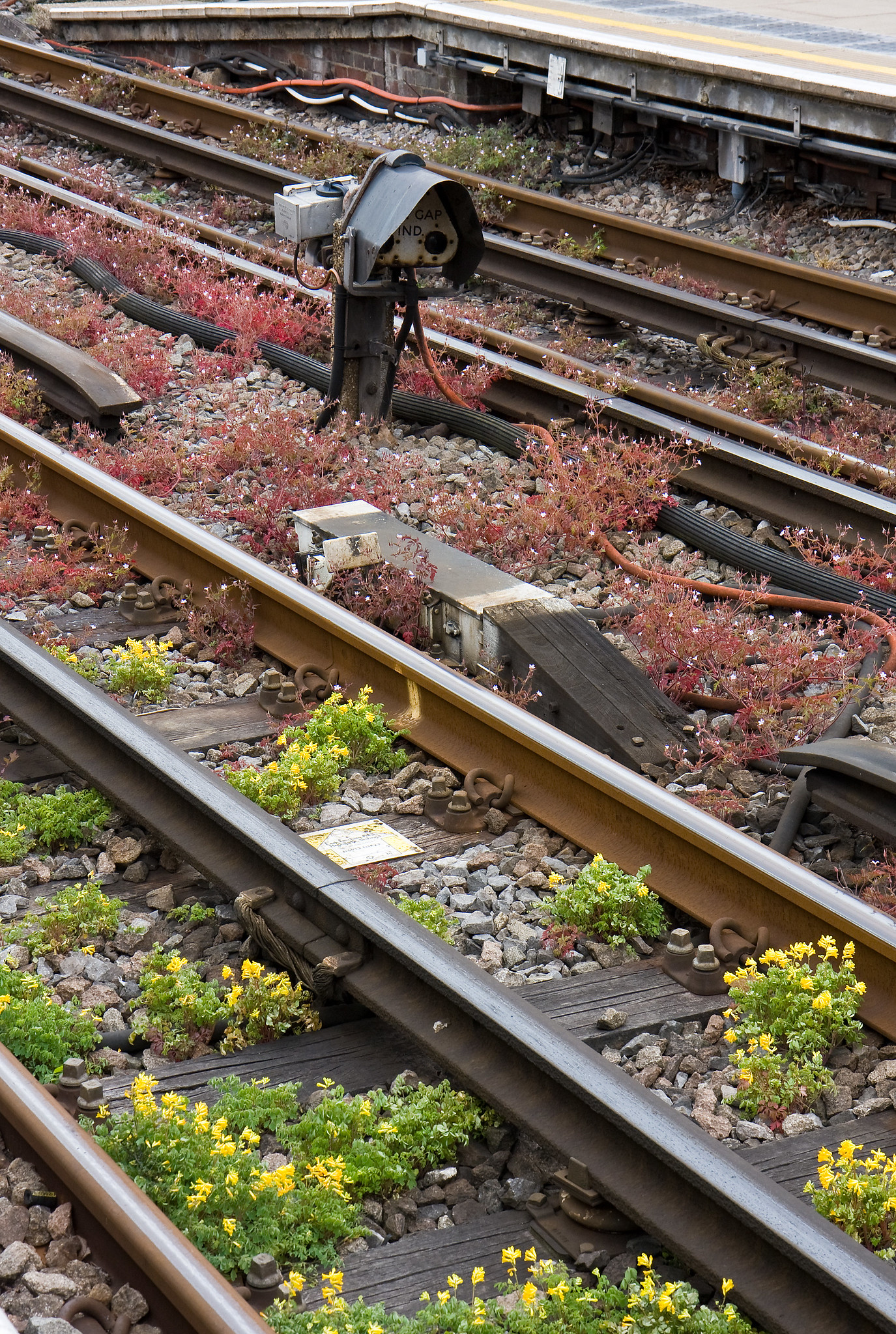 …And the item next to the running rail in the centre of the photo is a Tripcock Actuator. Its arm is raised when the signal is at danger and it will strike against a cock on the front of a passing train to automatically apply the brakes. The flowers are not helping with ‘k’s – they are Yellow Corydalis and Herb Robert.