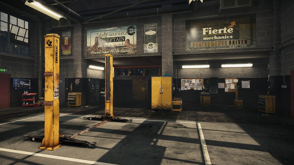 …All the basic machinery you’re going to need to start fixing cars is present – you can see the tyre removal and wheel-balancing rigs under the Fierte poster and the separator for shock absorbers is hiding behind the yellow locker. What you don’t have are work-benches to repair parts – how you get those is part of later gameplay and something that will have to be covered in another post. Go out the back of the main workshop and you can see there’s plenty of room for your business to expand…
