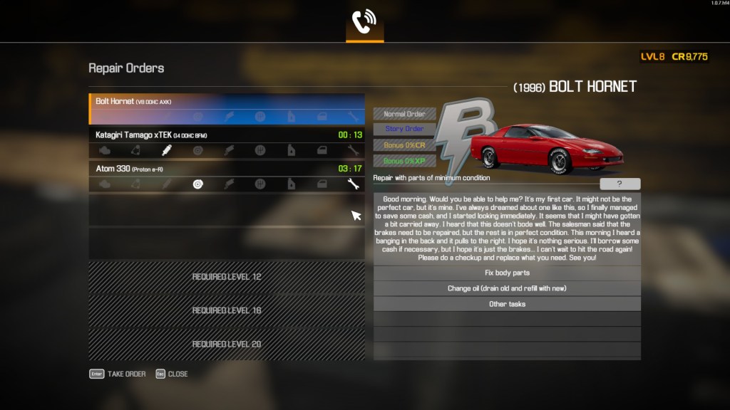 All of this rebuilding is probably the main activity in game but there are lots of story jobs to work through and doing jobs is a good way to keeping your cash flow under control 🙂 Here’s an example of a story job from level 8…