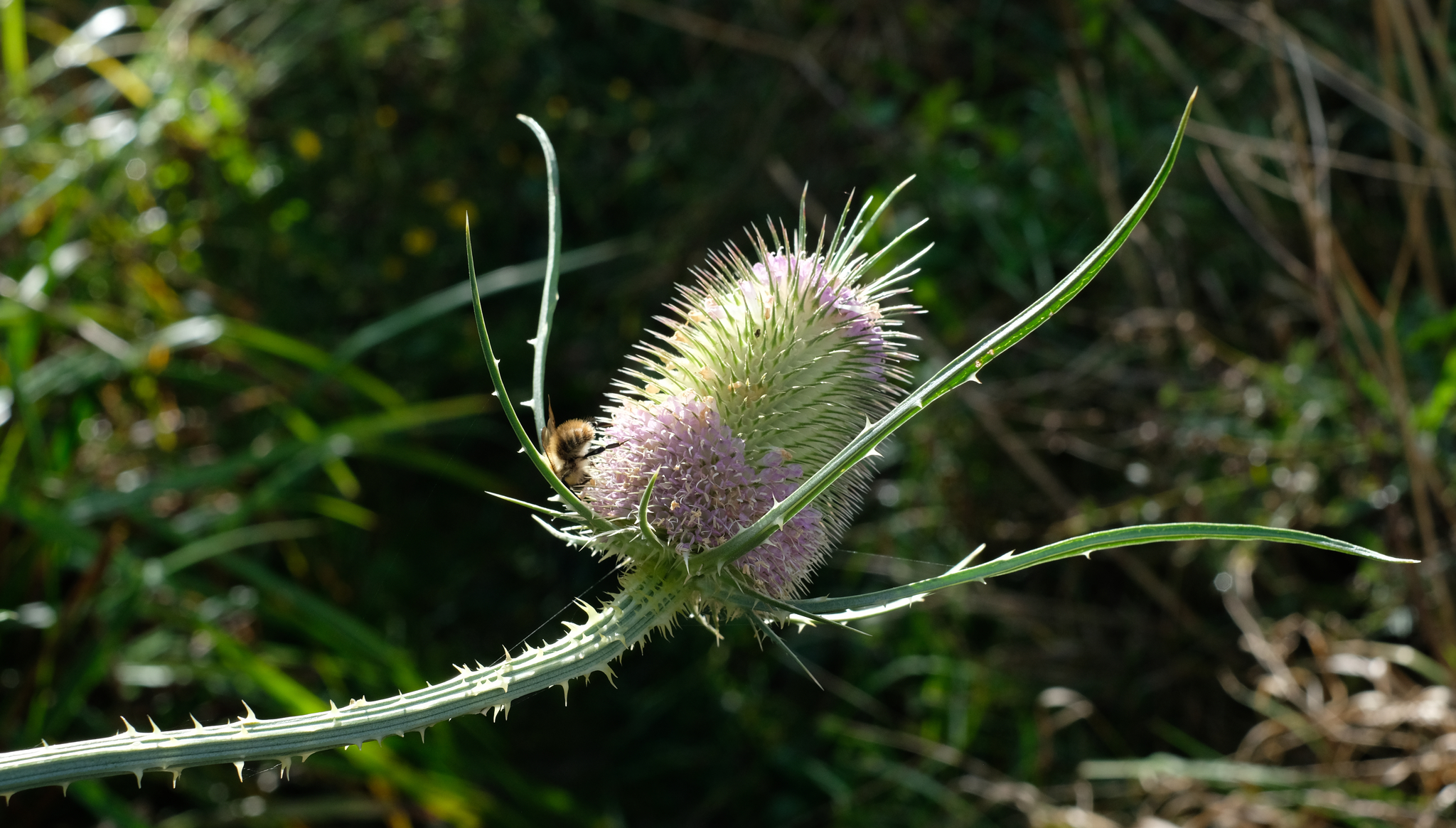 A trip down to the pasture, our local nature reserve, to find an end of season Teasel -its final flower providing nectar for a solitary Brown Banded Carder Bee…