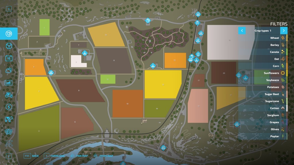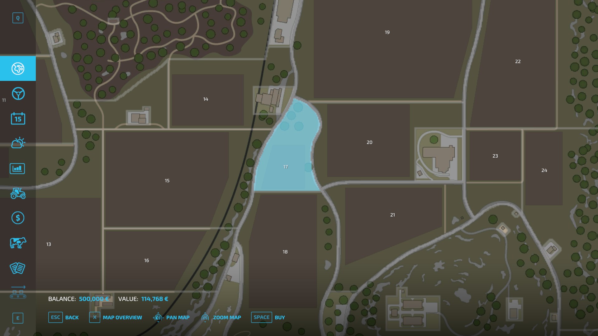 …The cheapest of which is field 2. I paid a visit to that field and field 1 as well. At the time I was starting my game field 2 had Grass sown – potentially a good earner over a period of time – and field 1 had just been cultivated ready for the next crop. The issue was the surrounding land – steep hillsides. The in-game farmhouse costs €150k but then you get charged for additional landscaping and the cost could have risen to double that. Fields 7 and 8 didn’t really work either for the same reason and field 12 had a slope to make a mountain blush 😉 There was a similar issue with field 24 (behind the crops listing on the right). Field 23 was out of the question because there was no room for any buildings. In the end I chose field 17…