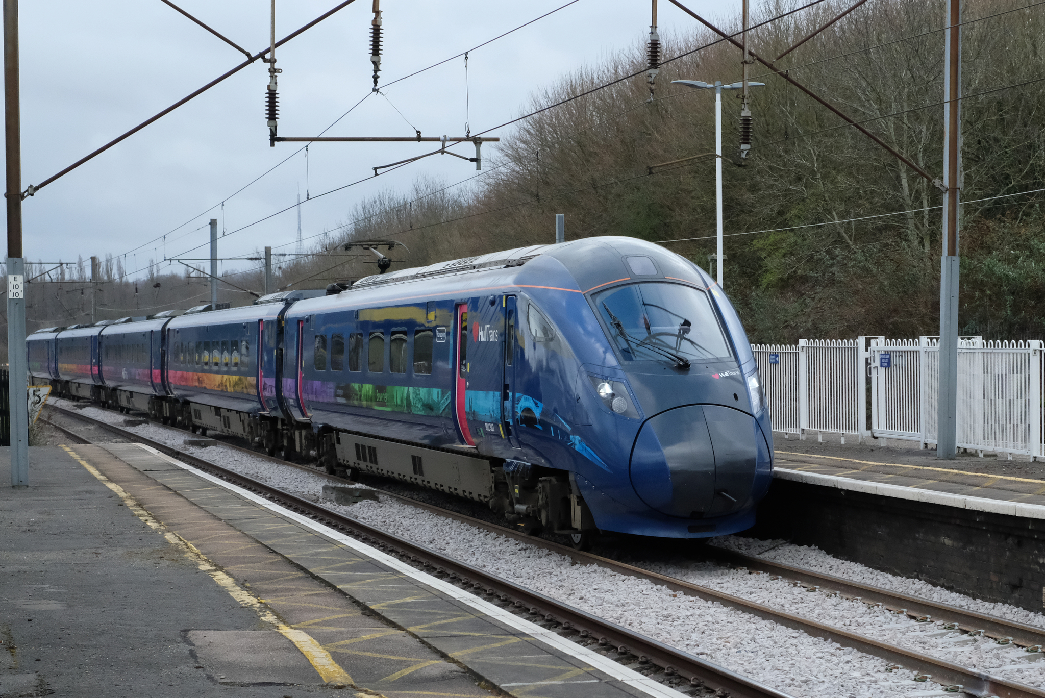 On Wednesday I happened to photograph a Hull Trains Class 802 at New Southgate – the waist stripe is a rainbow of photographic images…