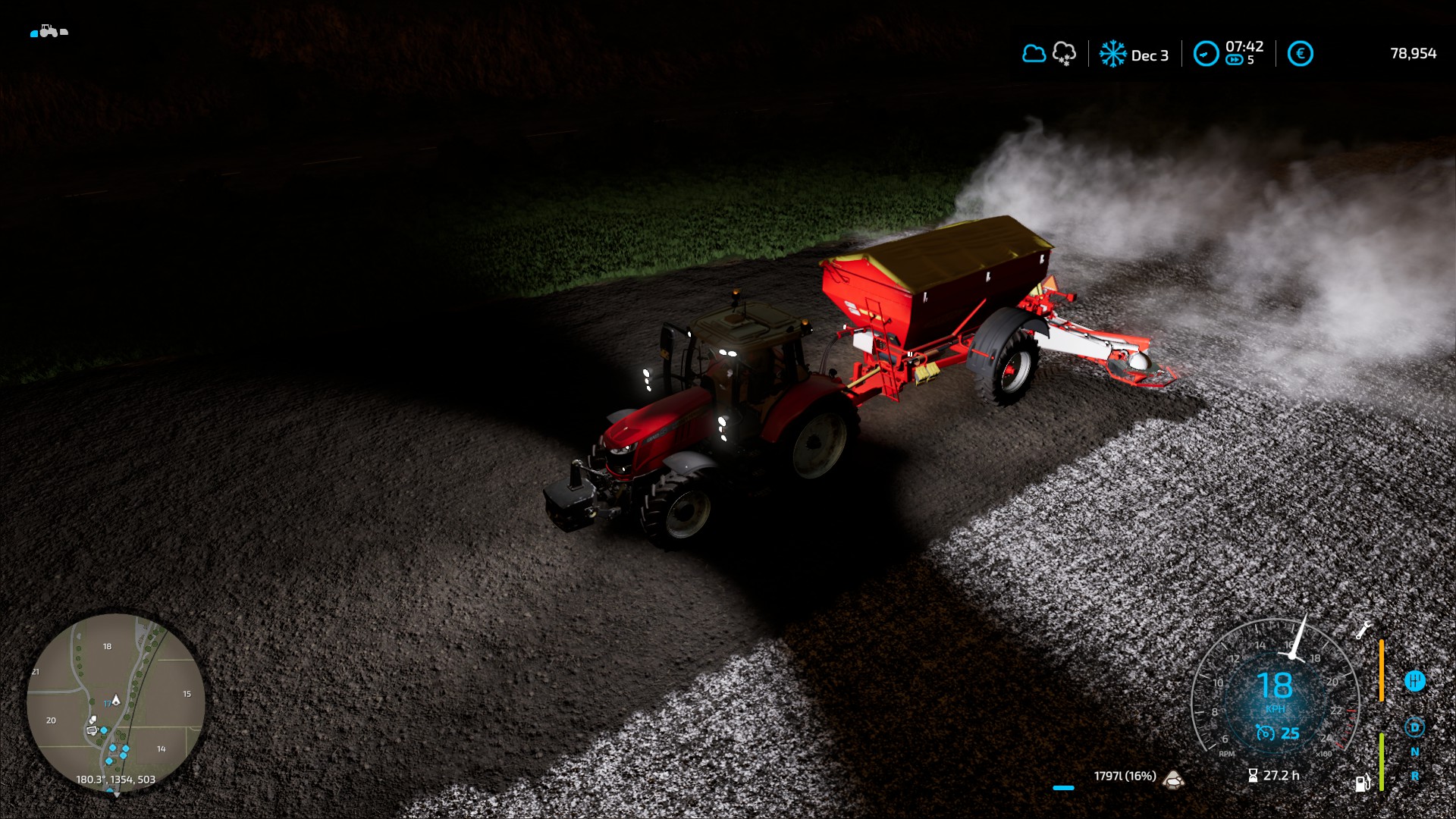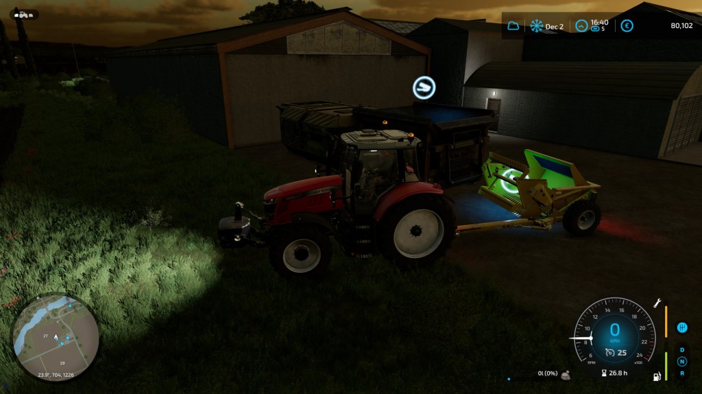 …by which time, it was getting dark. I had two last tasks for the evening. Returning the ‘picker to the dealer and then getting some lime into my spreader ready for the following morning. Then it was time for bed.
