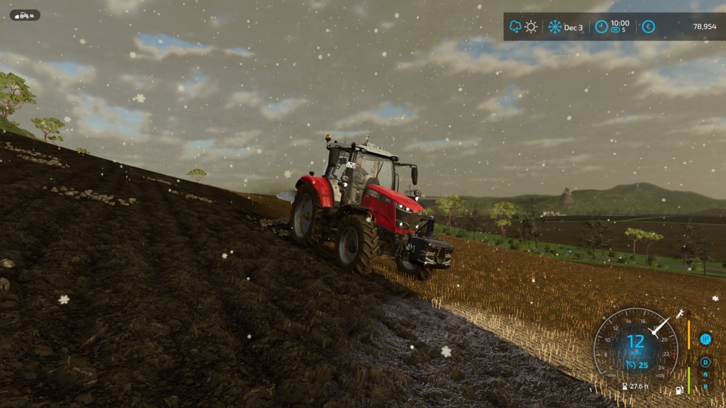 …The field was on the side of the valley and had a steep slope resulting in continuous corrections to the tractor steering to compensate for gravity and the natural pull of the plough. We had another flurry of snow as I worked on this job…