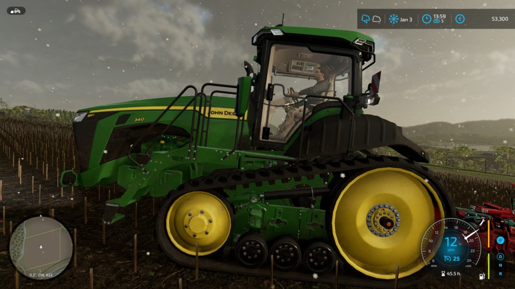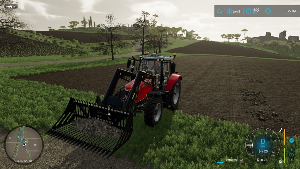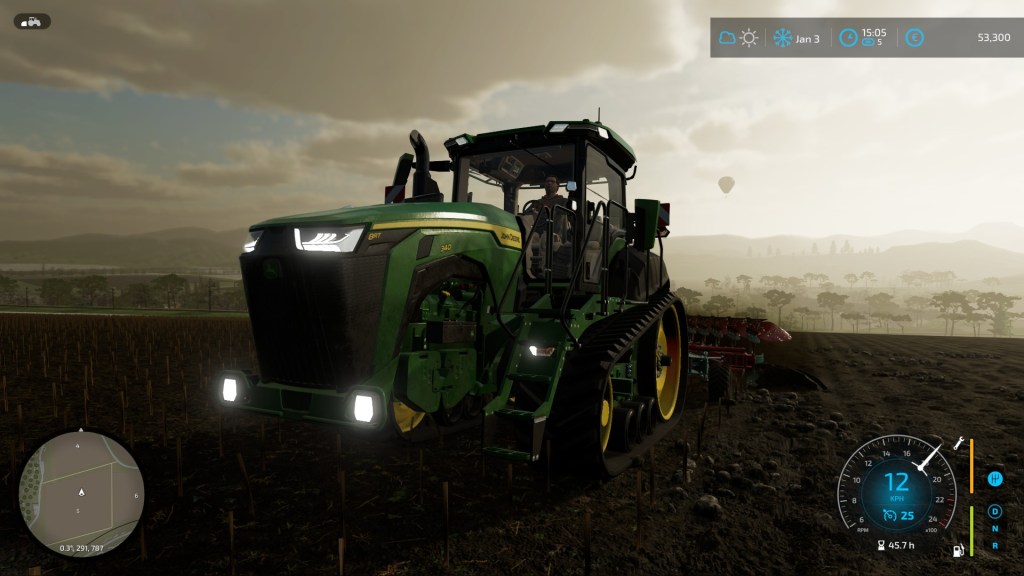 …Anyone who read some of my posts about Farming Simulator 19 will recall that I hate these ‘hinged’ ploughs. With a large field to work this time, I was able to refine my technique and start using the tool efficiently. The trick is to swing it round on itself in a tight circle and to only flip it once you’re lined up for the next cut. The job was made easier by the tracked tractor – it turns much sharper than a wheeled one!