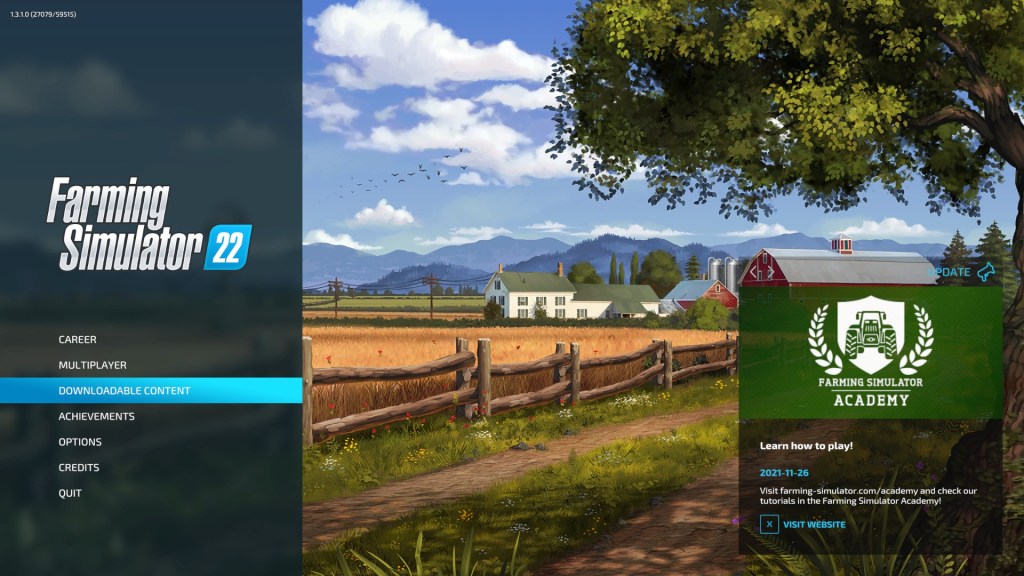 So here’s a tip for anyone looking to play this game. Because FS22 is a new game, mods are still filtering through. You can check for available mods from the front screen of the game by selecting Downloadable Content…