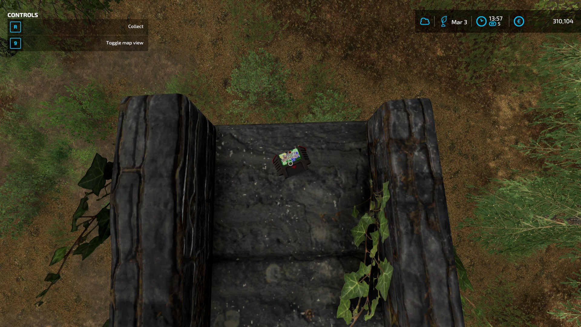 Collectables are an in-game bonus of sorts that used to be in Farming Simulator 17 but were not implemented in 19. They have returned to FS22. They take the form of toys on the US map and game cartridges on Haut-Beyleron. Each one you collect will give you €50K. So, after a morning’s fertilizing, I decided to spend my lunchtime seeking out some of these to boost my finances.