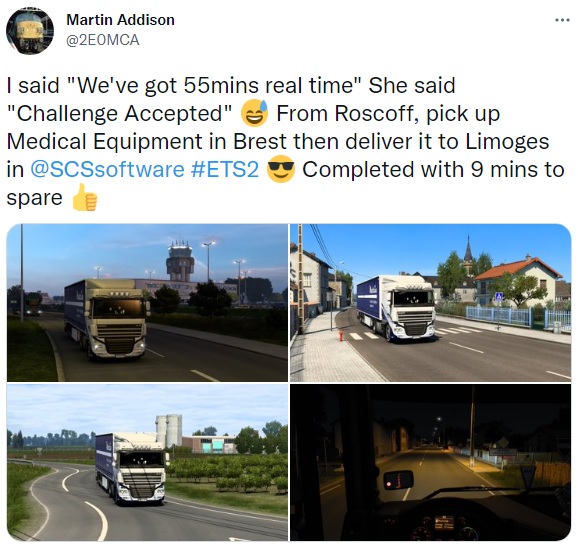 WoT jobs offer an additional aspect to gameplay as SCS often run community events through the External Contract Jobs. They also give access to a number of additional game achievements. Whilst very similar to Freight Market jobs, WoT jobs are real time rather than game time and they don’t have tiers of difficulty like Important and Urgent. That doesn’t mean that you won’t get jobs that require you to drive with a degree of urgency – whilst many jobs will allow you nearly 24 hours of real time to complete them, you will find some that you need to complete in much less time than that. Azyet and I had one of those earlier in the week – here’s my Tweet on the subject…