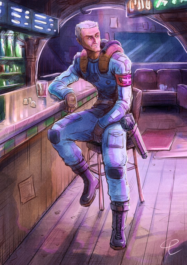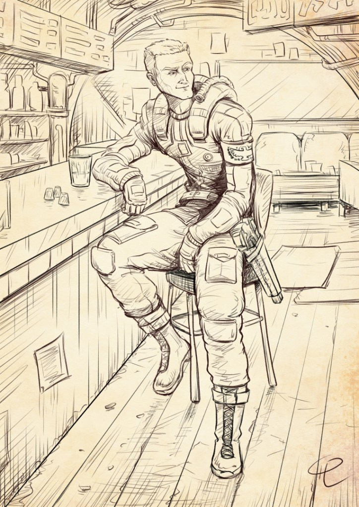 In many ways this digital art by Si’yann has captured the Jaxon Border I envisaged as I was writing and the decision to have him seated at the bar works so well for the character. Bounty hunter that he is, he’s clearly got his eye on something or someone seated away from the bar – possibly me, Anson22, just before our first meeting? π