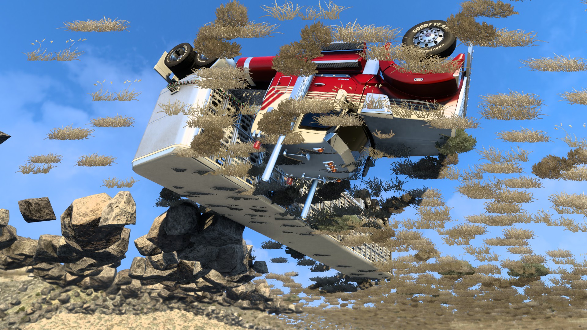 None of the above behaviours explain why Miss Lola is upside down and I appear to be viewing her from the underworld. Every game has glitches. Compared with some high-profile recent releases, the Truck Simulator games have very few. One glitch that occasionally manifests itself revolves around the ai. Normally an ai collision with either the player or another ai results in the ai stopping and putting on hazard lights – and the player cursing, stopping and switching to camera mode to photograph the villAIn 😉 Very occasionally, when one ai hits another, one of the vehicles is launched high into the air – and I mean passing airliner type high! So, there I was, cruising the I-80 just west of Laramie with a load of cattle, when suddenly a trailer dropped onto the highway just in front of Miss Lola. I barely had time to clock what it was and no time to take avoiding action. As I wrote in a community Tweet – “Bang!! 100% damage and burgers-on-the-hoof barbequed” 😉 It’s a very rare occurrence – in 6 years of play I have had ai vehicles spawn in front of my truck on 3 occasions and this is the first time I’ve had something drop out of the sky (though I have seen a very-occasional fly-by). That’s not a bad record for a game that has been in continual development throughout the time that I’ve been playing and represents just 4 bad experiences in over 5500 hours in the cab!